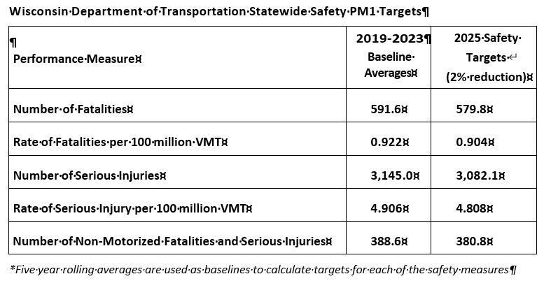 For the Wisconsin portion of the MIC area, the MIC Policy Board adopted the five safety performance measure targets set by the State of Wisconsin (WisDOT) for CY 2019, as follows: